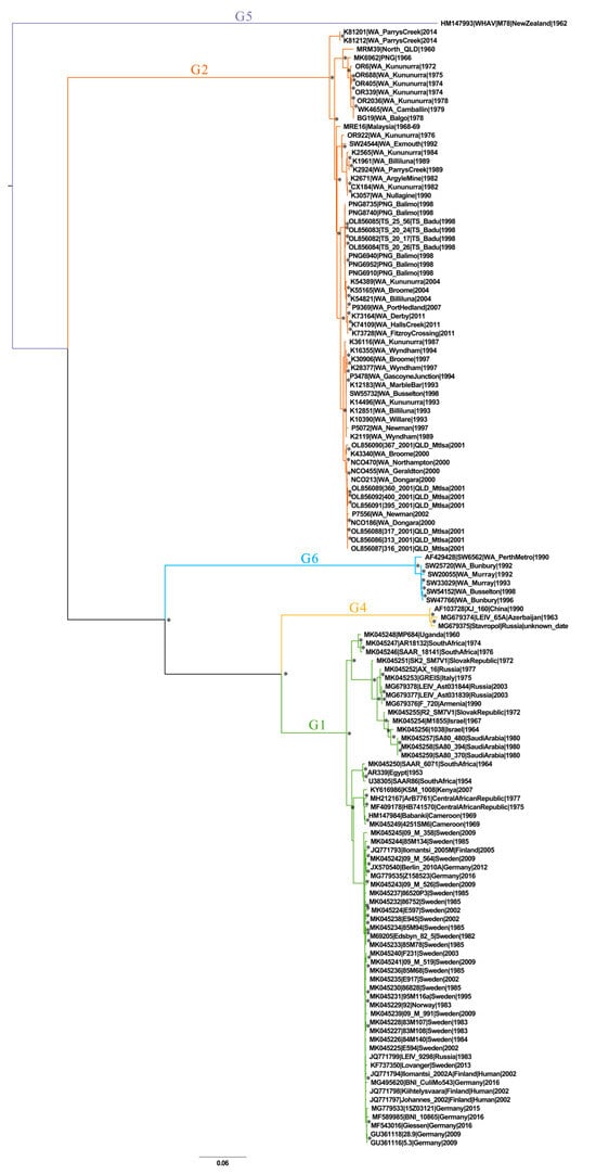 Interestingly, and as previously observed in partial gene sequence analyses, G6 viruses sampled from the south-west of WA were more closely related to G1 viruses derived from Europe and Africa than to G2 viruses sampled proximal to G6 within Australia [16]. G6 viruses have not been detected since 1998, and its origins remain enigmatic.