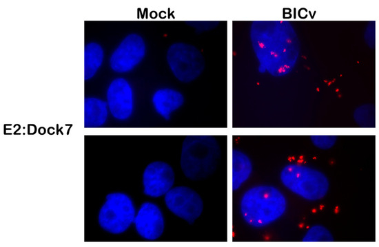 PLA for E2 and DOCK7 in SK6 cells infected or mock-infected with CSFV for 24 h with CSFV BICv (MOI = 10). Top and bottom panels on the right show different images with identical treatments. Magnification, ×1000. The figure shows results that are representative from one experiment performed three times, with a minimum of 100 cells analyzed in each experiment.