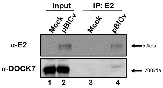 To further determine if the results from the PLA were the product of transient protein interactions or if E2 and DOCK7 were strongly bounded to each other, co-immunoprecipitation studies were conducted using cellular extracts of SK6 cells that were infected with CSFV. First, SK6 cells were infected with CSFV strain BICv at an MOI of 10 with cells being harvested 24 hpi, further described in Materials and Methods. Both mock infected and infected cell lysates were collected and were immunoprecipitated with WH303, an anti-E2 monoclonal antibody, and by Western blot detection for the presence or absence of DOCK7. A single band was observed showing a molecular mass of approximately 200 kDa, corresponding to the expected size of DOCK7 (Figure 2), clearly demonstrating that co-immunoprecipation occurred in CSFV-infected cell cultures between the structural protein E2 and host protein DOCK7. It should be noted that the DOCK7 that co-immunoprecipated with E2 was a slightly larger band that is observed in both the input cell lysate and pull down. Nonetheless, E2 and DOCK7 proteins’ interaction in CSFV-infected cells was demonstrated using two different, but specific, independent methodologies.