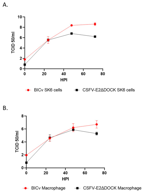 Growth kinetics in cells of swine origin. SK6 cells (A) and primary macrophage cell cultures (B) for E2ΔDOCK7v and parental BICv (MOI = 0.01). Two independent experiments were used to collect samples, at the indicated time points, and titrated in the corresponding cell substrate. Data represent means and standard deviations of three replicas. Sensitivity using this methodology for detecting virus is ≥log10 1.8 HAD50/mL.