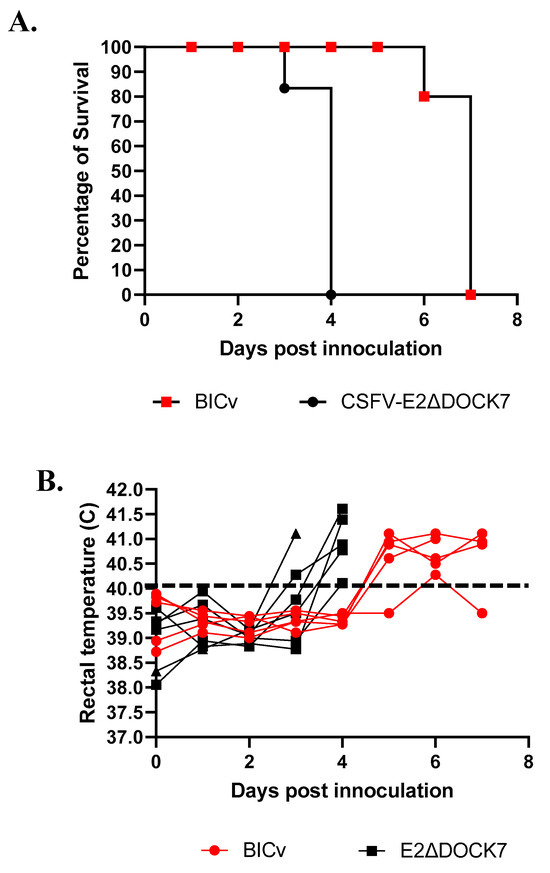 To assess the possible role of changing the amino acid in glycoprotein E2 in E2ΔDOCK7v during virus replication and in the progression of disease in the natural host, domestic pigs were infected with E2ΔDOCK7v under experimental conditions. Two groups, composed by five animals weighing 30–40 lbs, were IN infected with 105 TCID50 of either E2ΔDOCK7v or the parental BICv. When comparing these two groups on a daily basis, clinical signs associated with CSF were monitored. As expected, in the virulent BICv group, all the animals showed an increase in body temperature over 40 °C and displayed disease onset around day 5 pi with a quick evolution of the disease, with all animals euthanized by day 6–7 pi (Figure 4).