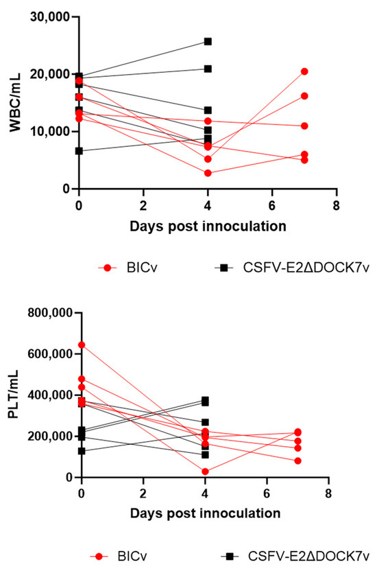Hematological changes in pigs that were IN inoculated with 105 TCID50 of E2ΔDOCK7v or BICv. Each curve represents individual animal values expressing concentration of platelets (PLTs) or white blood cells (WBCs)/mL of blood.