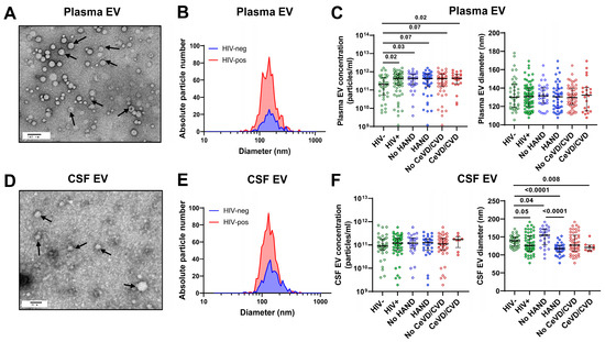 Plasma and CSF EV fractions were isolated and characterized by TEM, NTA, and immunoblotting for exosome markers (Figure 1). TEM revealed vesicles corresponding to the size of exosomes (Figure 1A,D). NTA showed that most particles were 30–150 nm in diameter, with a peak at 100–120 nm (Figure 1B,E). Immunoblotting detected the exosome markers CD9, CD63, and Flotillin-1 in both plasma and CSF EV fractions (Supplemental Digital Content S1), indicating an enrichment of exosomes. Plasma and CSF EV concentration and size were compared between groups by HIV status, HAND, and vascular disease (CeVD/CVD) (Figure 1C,F). Most plasma and CSF EVs were in the 90–150 nm size range of exosomes. Plasma EV concentrations were higher in PWH vs. HIV− controls (p = 0.02) but similar between groups by HAND or vascular disease status (Figure 1C). CSF EV concentrations were similar across groups irrespective of HIV status, HAND, or vascular disease, with median concentrations around 1011 particles/mL (Figure 1F). While plasma EVs showed no significant difference in size between groups, CSF EVs showed a decreased median size in PWH with HAND vs. no HAND (p < 0.0001) and PWH vs. HIV− controls (p = 0.05) (Figure 1C,F), possibly reflecting an increased production of exosomes (i.e., smaller-diameter EVs) by activated microglia/astrocytes and/or injured neurons.