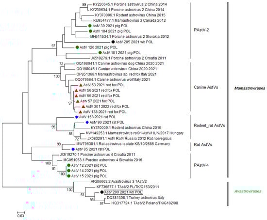 Phylogenetic relationship of nt sequences of astroviruses detected during this study with reference nt sequences available in GenBank database based on 320 bp fragment of RdRp gene. Phylogenetic tree was generated using the neighbor-joining method (Kimura2 parameter) as implemented in Mega5 software. Bootstrap values (1000 replicates) over 70%, indicating significant support for the tree topology, are shown next to the branches. All nt sequences of astroviruses detected during this study are highlighted with indicators: ●—porcine astroviruses, ▲—astroviruses detected in red foxes, ♦—astroviruses detected in rats, ●—included in a black box indicates Avastrovirus detected in wild boar.
