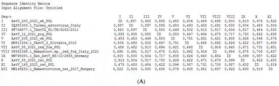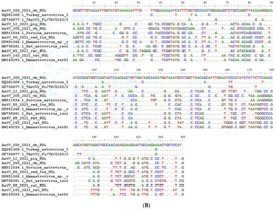 The lowest host specificity was determined for the astroviruses detected in wild boars. One of two astroviruses belonged to the PastV-2 group, revealing the highest percentage of nt identity to AstVs isolated from pigs in Poland (this study) and pigs and brown rats (Rattus norvegicus) collected in China. The second astrovirus isolated from a wild boar in this study (AstV_200_2021_wb_POL) was the most homologous to AstVs detected in farmed turkeys and guinea fowl in Italy between 2000 and 2005 (93.7% homologous nt within 230 nt RdRp fragment). The percentage of nt identity between AstV_200_2021_wb_POL and representatives of PAstV ranged between 45.3 and 55.5%. The phylogenetic relationships of AstVs with reference nt sequences of astroviruses are presented in Figure 2, whereas the percentages of nt identity and the alignment of representative strains of different astrovirus species used in the phylogenetic analysis with the TAstV detected in a wild boar are presented Figure 3.