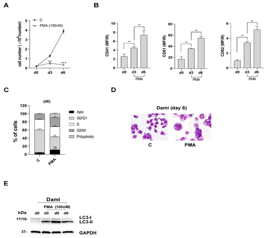 PMA inhibits proliferation and induces MK differentiation and autophagy that accompanies increased ploidy in PMA-Dami cells. (A) Cell growth analysis of PMA-Dami cells, in presence of PMA used at 100 nM and added every 2 days in cultures, as compared to untreated Dami cells of control (C). (B) Flow cytometry analysis of CD41, CD61 and CD62P increased expression during PMA treatment of Dami cells, from day 0 to day 6 of treatment. (C) Flow cytometry analysis of cell cycle and DNA-ploidy status of PMA-Dami cells on day 6, as compared to untreated (C) Dami cells. Percentage of cells at each phase of the cell cycle and DNA-ploidy are shown. (D) Morphology analysis of PMA-Dami (PMA) cells on day 6 is shown, as compared to untreated Dami cells (C); (E) Western blotting analysis of the autophagy-related protein LC3-II that increases during PMA treatment of Dami cells. GAPDH is shown as an internal control. (A–C) Mean (± SEM) of three independent experiments is shown. * p < 0.05; ** p < 0.01; *** p < 0.001; ns is for not significant. (D,E) One representative experiment of three is shown.