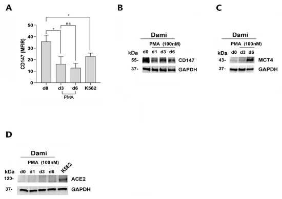 CD147 and MCT4 expression during PMA-induced MK differentiation of Dami cells, negative for ACE-2 expression. (A,B) CD147 protein expression decreases during the first days (from day d0 to day d3) of PMA treatment of Dami cells, but remains constant and well detectable from day 3 to day 6 of PMA treatment of Dami cells, as shown by flow cytometry analysis (A) and Western blot analysis (B). (C) MCT4 protein expression increases during PMA-induced MK-differentiation of Dami cells, as shown by western blot analysis. (D) ACE-2 protein expression is undetectable by western blot analysis, in Dami cells (d0) and during PMA-induced MK differentiation of these cells, as compared to K562, ACE-2 expressing cells. (A) Mean ± SEM of three independent experiments is shown. * p < 0.05; ns is for not significant. (B–D) One representative experiment out of three is shown; GAPDH is shown as an internal control. (D) K562 cells are a positive control for ACE-2 expression.