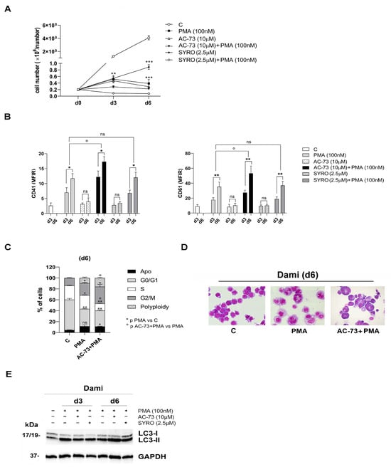 First, we calculated IC50, the concentration of AC-73 and SYRO that exhibit 50% cell viability for Dami and PMA-Dami cells (Supplementary Figure S2A–C). We performed time– and dose–response analysis using different concentrations of drugs, i.e., from 5 to 20 µM for AC-73 and SYRO. Then, we determined that 10 µM AC-73 and 2.5 µM SYRO inhibit Dami cell growth (Supplementary Figure S2D,E) without significant apoptosis (Supplementary Figure S2F,G) but by inducing autophagy, as previously described [,] and as shown by the increase in the LC3-II to LC3-I ratio in AC-73 (10 µM)-treated and SYRO (2.5 µM)-treated Dami cells, as compared to untreated Dami cells (C) (Supplementary Figure S2H,I). Altogether, our data indicate that 10 µM AC-73 and 2.5 µM SYRO are not cytotoxic to Dami cells. However, the use of AC-73 in combination with SYRO to treat Dami cells was toxic. Then, we administered AC-73 (10 µM) or SYRO (2.5 µM) every 48 h during the PMA-induced MK differentiation of Dami cells. AC-73 and SYRO have no significant effect on PMA-Dami cell proliferation (Figure 3A, AC-73+PMA and SYRO+PMA) as compared to PMA treatment (Figure 3A, PMA). AC-73, when used alone has no significant effect on the MK differentiation and maturation of Dami cells, significantly enhances the MK differentiation of PMA-treated Dami cells, as shown by increased CD41 and CD61 expression in (AC-73+PMA)-Dami cells, as compared to PMA-Dami cells, from day 3 to day 6 (Figure 3B). In addition, AC-73 used in combination with PMA promotes endomitosis in (AC-73+PMA)-treated Dami cells, as shown by the noticeable increase in the percent of cells in the G2/M phase and with polyploidy (8N) (Figure 3C), and by morphology analysis (Figure 3D) on day 6 of culture, as compared to PMA-Dami cells and control Dami cells (C). Then, we found that AC-73 has a synergic effect on the autophagy triggered by PMA during MK differentiation of Dami cells (Figure 3E). In contrast, SYRO used alone or in combination with PMA has no significant effect on MK differentiation of (SYRO)-Dami cells and (SYRO+PMA)-Dami cells, as compared to untreated (C) Dami cells and to PMA-Dami cells, respectively, from day 3 to day 6 (Figure 3B). We could not detect any noticeable change in the cell cycle and morphology of (SYRO+PMA)-Dami cells, as compared to PMA-Dami cells, and any relevant synergic effect of SYRO on the PMA-induced autophagy in (SYRO+PMA)-Dami cells, as compared to PMA-Dami cells, from day 3 to day 6 (Figure 3E).