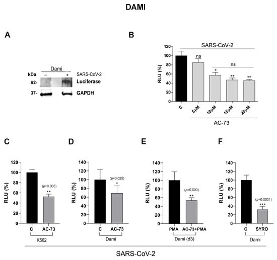 AC-73 and SYRO inhibit SARS-CoV-2 pseudovirus entry into Dami and PMA-Dami cells. (A) Western blotting analysis of luciferase protein expression in SARS-CoV-2 infected (+) Dami cells, as compared to non-infected (−) Dami cells, indicating SARS-CoV-2 spike protein entry into infected Dami cells. (B) Luciferase activity detected in Dami cells treated with increasing doses (5, 10, 15, and 20 µM) of AC-73, after 2 days of incubation with SARS-CoV-2 pseudovirus particles, is significantly lower in 10, 15, and 20 µM AC-73-treated Dami cells than luciferase activity detected in 5 µM AC-73-treated and untreated (C) Dami cells. (C) Luciferase activity detected in AC-73 (10 µM)-treated K562 cells incubated for 2 days with SARS-CoV-2 pseudovirus for infection is significantly lower (RLU AC-73: 52%) than the luciferase activity detected in untreated (C) K562 cells, for which infection is reported as RLU 100%. (D,E) Luciferase activity detected in AC-73 (10 µM)-treated Dami cells (RLU AC-73: 69%) and (AC-73+PMA)-treated Dami cells (RLU AC-73+PMA: 54%), incubated for 2 days with SARS-CoV-2 pseudovirus particles, is significantly lower than the luciferase activity detected in respective controls, untreated (C) infected-Dami cells (D) and infected-PMA-treated Dami cells (E), for which infection is reported as RLU 100%. (F) Luciferase activity detected in SYRO (2.5 µM)-treated Dami cells (RLU SYRO: 32%), incubated for 2 days with SARS-CoV-2 pseudovirus particles, is significantly lower than the luciferase activity detected in untreated (C) infected-Dami cells (RLU C: 100%). (A) One representative experiment out of three is shown; GAPDH is shown as an internal control; molecular weight (kDa) is indicated. (B–F) Mean ± SEM of three independent experiments is shown. * p < 0.05; ** p< 0.01; *** p< 0.001; ns is for not significant. RLU, relative light unit.
