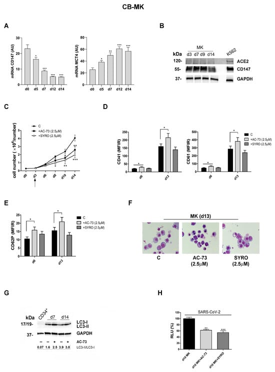 AC-73 treatment enhances autophagy, promotes MK differentiation of CD34+ HPCs purified from human CB and inhibits SARS-CoV-2 pseudovirus entry into MK-HPCs. (A) CD147 and MCT4 mRNAs are inversely expressed during MK differentiation of CD34+ HPCs, as shown by qRT-PCR analysis. (B) CD147 protein expression level is high, while ACE-2 protein expression is undetectable in MKs, as shown by western blotting analysis. (C) The treatment of 2.5 µM AC-73 and SYRO started at day 3 (arrow) and added every 2 days in MKs cultures significantly impair cell growth of MKs as compared to untreated (C) MKs (D–F) AC-73, but not SYRO, significantly enhances MK differentiation and maturation, as shown by the major increase of CD41, CD61, and CD62P expression detected on cell surface of MKs+AC-73 on day 6 and day 13, as compared to MKs+SYRO and to untreated (C) MKs, and by (F) morphology analysis. (G) AC-73 enhances the autophagy required for MK differentiation of HPCs, as shown by western blotting analysis of autophagy-related protein LC3 and its conversion from LC3-I to LC3-II on day 7 and day 14 in AC-73 treated (+) MKs, as compared to untreated (− AC-73) MKs on day 7 and day 14 and to CD34+ HPCs. Densitometric data for the LC3B-II to LC3B-I ratio are shown. (H) Luciferase activity detected on day 10 of culture in MKs+AC-73 (2.5 µM) (RLU d10 MK+AC-73: 60%) and in MK+SYRO (2.5 µM) (RLU d10 MK+SYRO: 58%), incubated 2 days with SARS-CoV-2 pseudovirus particles, is significantly lower than the luciferase activity detected on day 10 of culture in untreated day 10 MKs (RLU d10 MK: 100%). (A,C–E,H) Mean ± SEM of three independent experiments is shown. * p < 0.05; ** p < 0.01; *** p < 0.001. (B,G) One representative western blot out of three is shown; GAPDH is shown as an internal control. (F) One representative morphological analysis is shown.