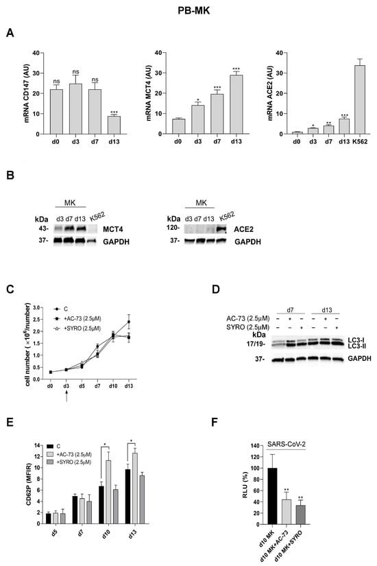 AC-73 and SYRO, which enhance autophagy during MK differentiation of CD34+ HPCs purified from human PB, expressing CD147, MCT4, a low level of ACE-2, without significant effect on MK differentiation for SYRO, both inhibit SARS-CoV-2 pseudovirus entry into MK-HPCs from PB. (A) CD147 and MCT4 mRNA are inversely expressed, while ACE-2 mRNA expression is also detected during MK differentiation of CD34+ HPCs purified from PB, as shown by qRT-PCR analysis. (B) MCT4 protein expression increases during MK differentiation of CD34+ HPCs from PB, while ACE-2 protein expression is detectable, even though at very low level, on day 13 of MK differentiation, as shown by western blotting analysis. (C) The treatment of 2.5 µM AC-73 and SYRO treatment, started on day 3 (arrow) and added every 2 days in megakaryocytic cultures, had no significant effect on cell growth of MKs, as compared to untreated (C) MKs. (D) AC-73 and SYRO enhance the autophagy required for MK differentiation of HPCs, as shown by western blotting analysis of autophagy-related protein LC3 and its conversion from LC3-I to LC3-II on day 7 and day 13 in AC-73 or SYRO treated (+) MKs, as compared to untreated (−) day 7 and day 13 MKs and to control CD34+ cells. (E) AC-73 significantly enhances MK differentiation, as shown by the increased expression of CD62P in MKs from day 5 to day 13, as compared to SYRO, without significant effect on MK differentiation of HPCs (+SYRO) and to untreated (C) MKs. (F) Luciferase activities detected on day 10 of culture in AC-73 (2.5 µM) and SYRO (2.5 µM)-treated MKs (RLU d10 MK+AC-73: 44%; RLU d10 MK+SYRO: 34%), incubated 2 days with SARS-CoV-2 pseudovirus particles, are significantly lower than the luciferase activity detected at day 10 in untreated MKs (RLU d10 MKs: 100%). (A,C,E,F) Mean ± SEM of three independent experiments is shown. * p < 0.05; ** p < 0.01; *** p < 0.001; ns is for not significant. (B,D) One representative western blot out of three is shown; GAPDH is shown as an internal control; molecular weight (kDa) is indicated.