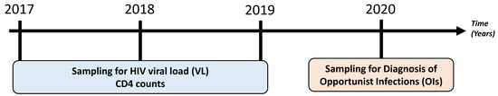 From January to June 2020, we conducted a retrospective and cross-sectional study of PLWHA who were monitored at the CTA in Franceville, a city of roughly 7000 inhabitants in the south-eastern region of Gabon. Patients were recruited between June 2018 and September 2019 to perform a one-time CD4 count and HIV-1 RNA viral load measurement at diagnosis (as described in Section 2.3) free of cost to patients at the Centre Interdisciplinaire de Recherches Médicales de Franceville (CIRMF). According to medical records (2017–2019) filed at the CTA of Franceville, the recruitment criteria were as follows: (i) being confirmed HIV-1-positive, (ii) being on antiretroviral therapy (ART), and (iii) providing informed consent. The additional information collected included gender, age, ART regimen, and CD4 count at ART initiation. Patients who did not show a CD4 count and/or viral load during diagnosis of the opportunistic diseases, and those who had interrupted their follow-up at the CTA, were excluded from the study. Figure 1 presents the timeline of the study.