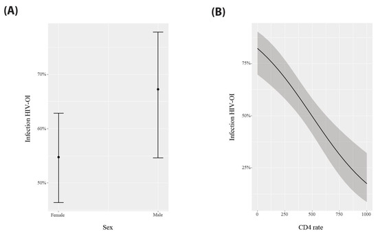 The best model (ΔAIC = 0) resulting from our generalized linear model (GLM) indicates that two out of the seven sociobiological factors identified among PLWHA receiving ART were linked to the development of OIs. These factors were identified as gender and the initial value of the CD4 T-cell count (Table 2 and Figure 3). Consequently, male patients (Figure 3A) with suboptimal CD4 lymphocyte levels (Figure 3B) had a greater risk of developing OIs.