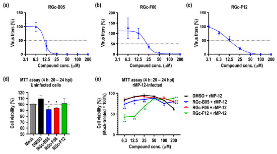 3.2. Antiviral Efficacy and Cell Toxicity of RGc-B05, RGc-F06, and RGc-F12 Compounds in Vero Cells