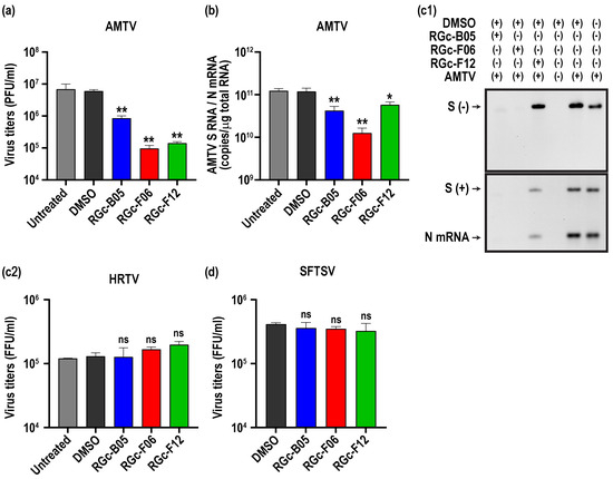 3.4. Antiviral Efficacy of RGc-B05, RGc-F06, and RGc-F12 Compounds against Arumowot Virus or Bandaviruses