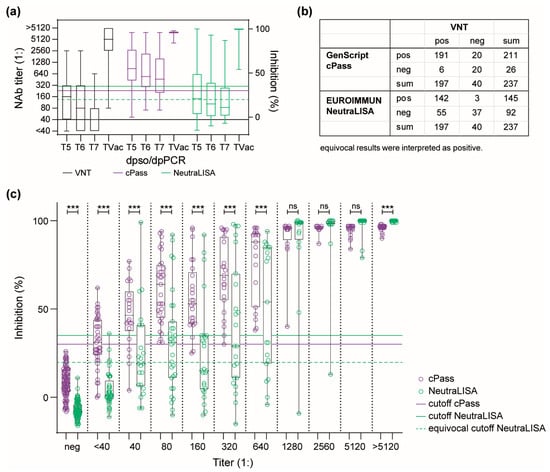 (a) Decrease of NAbs in sera from convalescent patients over time, as determined by three different NTs. Results obtained using VNT (black) are plotted on the left Y-axis; those obtained using cPass (purple) and NeutraLISA (green) are plotted on the right Y-axis. (b) Number of NAb positive and negative sera by cPass and NeutraLISA compared to VNT. (c) Comparison of inhibition detected by cPass and NeutraLISA at the corresponding VNT NAb titers: *** = p ≤ 0.001, ns = not significant, and neg = pre-pandemic samples.