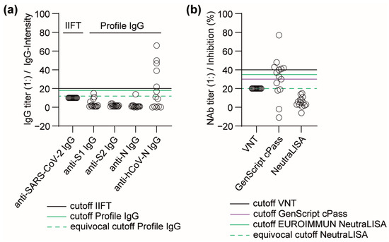 In addition to the studied VNT, two different surrogate virus neutralization tests, the GenScript cPass (GenScript, Piscataway Township, NJ, USA) and the SARS-CoV-2 NeutraLISA (EUROIMMUN), were used to determine NAb. The tests were performed according to the instructions of the respective manufacturer. Briefly, the cPass was performed using diluted serum (1:10) preincubated with horseradish peroxidase (HRP)-labeled RBD (37 °C, 30 min) and transferred to hACE2-precoated wells (37 °C for 15 min). RBD and hACE2 binding were detected by HRP-catalyzed color reactions. A signal strength of ≥30% was considered positive, and <30% was negative.