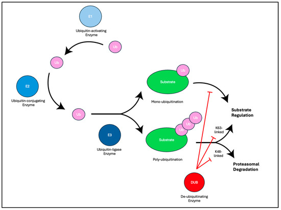 These viruses utilize many cellular mechanisms of post-translational modifications (PTMs) to modify protein function and avoid detection within the host cell, including through ubiquitin-controlled substrate regulation and degradation pathways (Figure 1) [4,5]. Ubiquitin is an 8.5 kDa protein found in almost every cell in the body, which commonly serves both regulatory functions, as well as marking substrates for degradation by the proteosome [18]. There are three classes of cellular enzymes (E1, E2, and E3) which are responsible for the ubiquitination of substrates. There are two human E1s, thirty-five E2s, and hundreds of E3s [19,20]. Initially, ubiquitin is activated in an ATP-dependent process by the ubiquitin activating enzyme (E1). The ubiquitin-conjugating enzyme (E2) then promotes the transfer of ubiquitin from the E1 to the active site of the E2 enzyme. Finally, the ubiquitin ligase (E3) performs the final step for creating an isopeptide bond between the lysine residue of the target protein and the C-terminal glycine of ubiquitin [21]. There are exceptions in which amino acids other than lysine residues can be ubiquinated, such as the amino terminal methionine of a protein [22,23]. Protein substrates can be either monoubiquitinated or polyubiquitinated. Ubiquitin contains seven lysine residues (K6, K11, K27, K29, K33, K48, K63), through which polyubiquitin chains are connected [21]. Of these, two in particular are the most studied, Lysine-48 (K-48) and Lysine-63 (K-63), and have been shown to have specific signaling functions. Substrates that are K-48 ubiquitin-tagged are generally associated with that substrate being marked for proteasomal degradation, and K-63 ubiquitin tags tend to have downstream regulatory effects on the tagged substrate [21,24]. Ubiquitin can also be removed from substrates by over 100 cellular deubiquitinating enzymes (DUBs) which further regulate the ubiquitin-mediated pathways [25]. Several viral families, including Picornaviridae, Adenoviridae, Coronaviridae, Bunyaviridae, and Herpesviridae, encode their own deubiquitinating enzymes [26,27,28,29,30,31]. The human herpesvirus encodes a late lytic protein with conserved DUB activity found within the viral tegument [32].