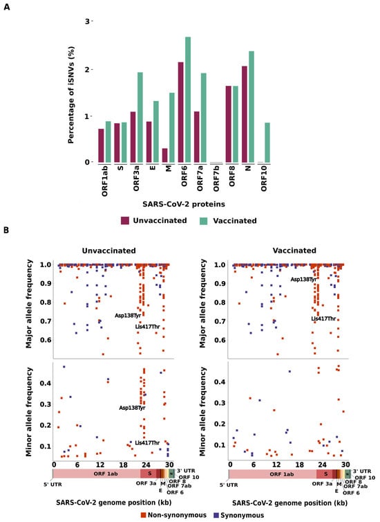 Intra-host genetic diversity of SARS-COV-2 after two doses of CoronaVac: (A) Percentage of iSNVs across the SARS-CoV-2 genome from unvaccinated and vaccinated patients in relation to gene size; (B) Major and minor allele frequency for non-synonymous (blue) and synonymous (orange) variants in the unvaccinated and vaccinated groups. Coding regions of the SARS-CoV-2 genome, based on the reference genome (NC_045512.2), are shown at the bottom of the figure. ORF: open reading frame. S: spike. E: envelope. M: membrane. N: nucleocapsid.