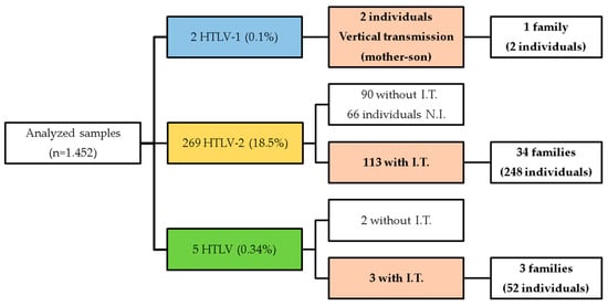 - Amianti, C.; Bandeira, L.M.; Cesar, G.A.; Weis-Torres, S.; Tanaka, T.S.O.; Machado, I.R.; Gonçalves, C.C.M.; Simionatto, S.; Schnaufer, E.C.D.S.; Freitas, F.B.; et al. HTLV infection in Brazil’s second-largest indigenous reserve. Sci. Rep. 2022, 12, 16701. [Google Scholar] [CrossRef] [PubMed]