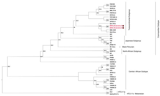 - Pereira, C.; Casseb, S.M.M.; Nobre, A.F.; Reis, M.N.L.; Costa, C.A.; Covre, L.S.C.; Sousa, M.S. Epidemiological Description and Molecular Characterization of Intrafamily Transmission of Human T-Lymphotropic Virus Type 1 in an Endemic Region of Brazil. Preprints 2023, 2023020128. [Google Scholar] [CrossRef]