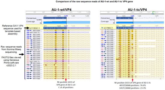 Comparison of the raw sequence reads around aa position 475 of AU-1-wt and AU-1-tc VP4 gene. Full genome sequences of AU-1-wt and AU-1-tc were generated by Illumina Miseq sequencing. FASTQ files were viewed using Geneious Prime software v2023.2.1.