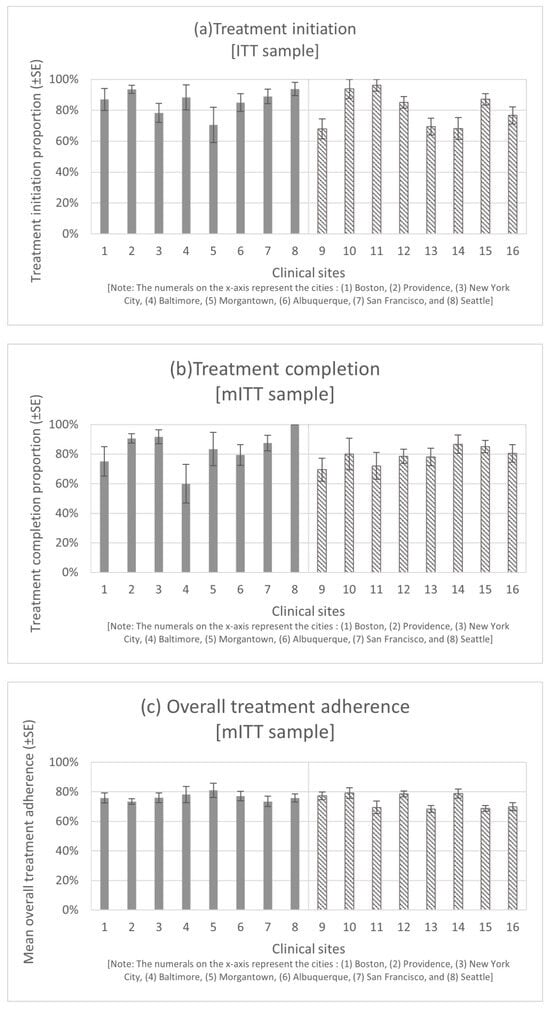 The average overall treatment adherence reached a maximum of 81% and a minimum of 73% among the OTP sites, whereas among the CHC sites, the maximum and minimum averages were 79% and 68%, respectively. The ICC was estimated to be 0.026 (0.005, 0.054) for overall treatment adherence among the 16 clinical sites.
