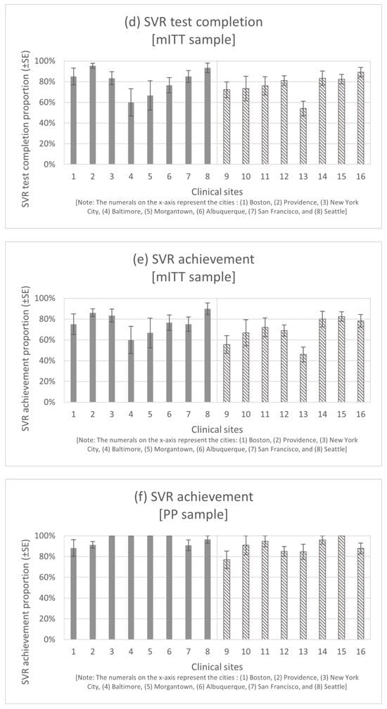 In the mITT sample, the highest and lowest SVR achievement proportions were 90% and 60%, respectively, among the OTP sites, and 82% and 46%, respectively, among the CHC sites. In the PP sample, the highest SVR achievement proportion of 100% was achieved at four locations among the OTP sites and at one location among the CHC sites. The lowest SVR achievement proportion was 88% among the OTP sites. Among the CHC sites, the highest and lowest SVR achievement proportions were 100% and 77%, respectively. The ICC for SVR achievement was estimated to be 0.070 (0.014, 0.122) in the mITT sample and 0.143 (0.021, 0.422) in the PP sample among the 16 clinical sites.