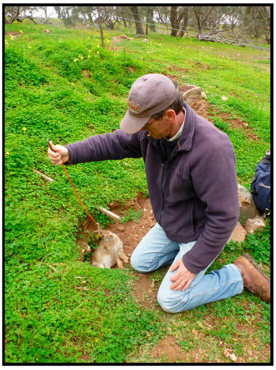 Carcass sampling involves visual searches for dead rabbits at the site of a known population, including smelling of burrows and visual inspection of burrows using a torch (Figure 1). For each rabbit carcass recovered, necropsy is conducted on site and any visual signs of RHDV or myxomatosis and timing of death are noted. These include pale reticulated liver and/or dark enlarged spleen common in RHDV mortalities, lesions and excretions around the eyes and genitals for myxomatosis, as well as the presence and size of maggots for estimating date of death [20]. Where carcasses are fresh, the liver is preferentially sampled (a known high source of virus [21]), followed by other remaining organs. For older, significantly scavenged or decomposed carcasses, bone marrow can be extracted from leg bones to attempt viral RNA extraction. New gloves and a scalpel are used for each carcass to minimise the risk of cross contamination. Carcasses are left where they were found to continue spreading the virus naturally. The tissues are subject to RT-PCR analysis to confirm the presence of RHDV, identify genetic variants of the pathogen and allow pathogen evolution to be traced over time [22].