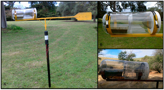 Active monitoring of rabbit haemorrhagic disease virus activity and variants by trapping of flies, the primary vectors using a wind-orienting fly trap [23]. (A) Full trap including base and wind-orienting vane. (B) Close view of trap canister with bait in the left compartment and fly-accumulating compartment on the right where flies enter through a small hole in the tip of the gauze funnel. (C) Close view of trap canister containing trapped flies.