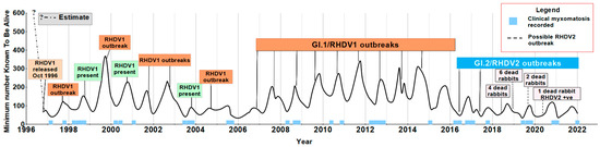 Minimum number of rabbits Known To Be Alive at Turretfield, South Australia, 1996–2022. The data was derived from live trapping approximately every eight weeks and individual tagging of captured rabbits. Estimated rabbit numbers for 1996 pre-RHDV1 release are based on ~50% of dead rabbits in 1999 outbreak being tagged, and greater pasture damage in 1996 at virus release.