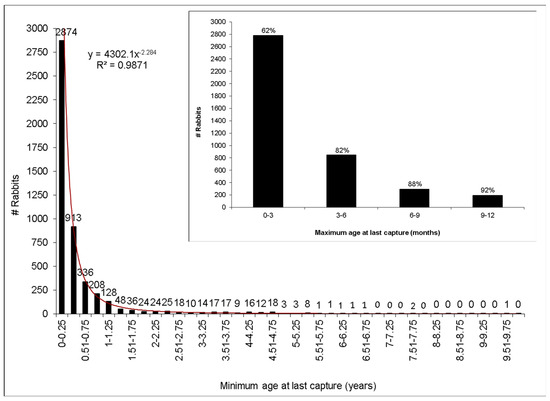 Longevity of rabbits captured at Turretfield, South Australia, 1996–2018 (n = 4769). Minimum age at their last capture is used because some rabbits were first captured as adults and their real age could not be estimated. Inset shows the rate of mortality for rabbits that survive < 12 months (n = 4118) with an initial weight ≤1300 g enabling their age to be estimated using a growth rate of 10 g/day [15; % is cumulative of total rabbits; n = 4455].