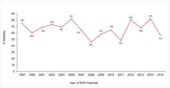 Figure 5. Mortality of infected rabbits at Turretfield, South Australia, following RHDV1 outbreaks (1997–2015). Data labels are the number of infected rabbits for the associated percentage mortality.