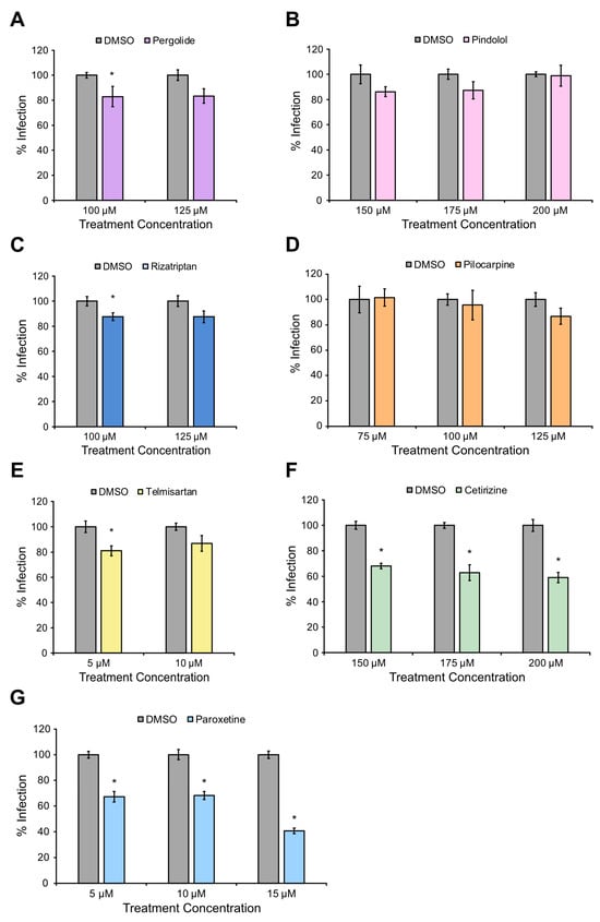 Cetirizine and paroxetine significantly reduce JCPyV infection in glial cells. SVGA cells were pre-treated with either drug or DMSO at 37 °C for (A–D,F,G) 1 h or (E) 2 h and then infected with JCPyV (MOI = 1 FFU/cell) in the absence of drug at 37 °C for 1 h. Cells were fed with media containing the drug or DMSO control and incubated at 37 °C for 48 h. Cells were fixed and stained for viral TAg and DAPI (total cells). FFU assay was used to quantify infection of 5 FOV/well at 20×, and percent infection was determined by dividing the number of TAg+ cells by the total number of cells and normalizing to 100%. Graphs represent 3 biological replicates performed in triplicate with error bars representing SEM. Statistical significance was determined using Student’s t-test. *, p < 0.05.