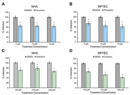 Paroxetine and cetirizine reduce JCPyV infection in primary glial and kidney cells. (A,C) NHA cells or (B,D) RPTECs were pre-treated with (A,B) paroxetine or (C,D) cetirizine at 37 °C for 1 h and infected with JCPyV ((A): MOI = 2 FFU/cell, (B–D): MOI = 3 FFU/cell) in the absence of drug at 37 °C for (A,B,D) 1 h or (C) 2 h. Cells were incubated in media containing DMSO or drug at 37 °C for (A,C) 48 h or (B,D) 72 h before being fixed. Cells were stained for TAg and DAPI, and FFU assay was performed to quantify infection of 5 FOV/well at (B,D) 20× or 10× (A,C). Percent infection was calculated by dividing the number of TAg+ cells by DAPI+ cells and normalized to 100%. Three biological replicates are presented in each graph, and error bars represent SEM. Statistical significance was determined using Student’s t-test. *, p < 0.05.