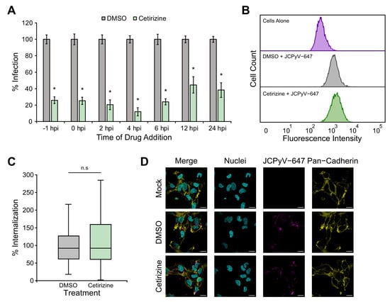 To further understand at which step in the JCPyV infectious cycle cetirizine reduced infection, a time of addition assay was performed. SVGA cells were treated with cetirizine at indicated time points prior to or after infection with JCPyV. Cetirizine significantly reduced infection at all evaluated time points, but the greatest reduction occurred between 1 h prior to and 6 h post-infection (hpi) (Figure 3A). These time points correlate with attachment, entry, trafficking, and GPCR signaling steps in the JCPyV infectious cycle [25,28,30]. The impact of cetirizine on viral attachment was evaluated using flow cytometry in which SVGA cells were treated with cetirizine or DMSO and then infected with Alexa 647-labeled JCPyV (JCPyV-647) on ice to allow for viral attachment. Analysis by flow cytometry revealed no significant difference in the mean fluorescence intensity between cetirizine and DMSO-treated samples, implying that cetirizine does not affect viral attachment to host cells (Figure 3B). The next step in the infectious cycle, entry, was assessed using confocal microscopy. SVGA cells pre-treated with cetirizine or DMSO were infected with JCPyV-647 at 4 °C for 1 h to allow for viral attachment and then shifted to 37 °C for 2 h for viral internalization. Cells were fixed and stained for pan-cadherin to mark the plasma membrane for imaging by confocal microscopy. Viral internalization was evaluated using ImageJ by measuring the mean fluorescence of internalized virus in DMSO- compared to cetirizine-treated cells. Results showed no reduction in viral internalization in cetirizine-treated samples compared to the control, indicating that cetirizine does not block viral entry (Figure 3C,D). In sum, cetirizine significantly reduced JCPyV infection in SVGA cells throughout the infectious cycle through a mechanism other than viral attachment and entry.