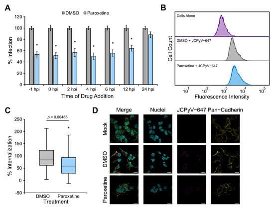 To further explore which step in the JCPyV infectious cycle paroxetine acts upon, a time of addition assay was performed. SVGA cells were treated with paroxetine prior to, during, or post-infection with JCPyV at the indicated time points, and infection was quantified by ICW assay. Paroxetine significantly reduced infection at time points up to 12 hpi, and these early time points are consistent with viral attachment, entry, and trafficking as well as host GPCR signaling (Figure 4A) [25,28,30]. To investigate whether paroxetine impacts viral attachment to host cells, flow cytometry was utilized (Figure 4B). SVGA cells were treated with paroxetine or DMSO and incubated with JCPyV-647 on ice to allow viral attachment while preventing internalization. Flow cytometry analysis of the mean fluorescence intensity between samples treated with paroxetine or control showed no significant difference, indicating that paroxetine does not impact JCPyV attachment to SVGA cells (Figure 4B). Further, confocal microscopy was utilized to assess the effect of paroxetine on viral internalization (Figure 4C,D). SVGA cells were treated with paroxetine or DMSO, and experiments were performed as described above. The findings demonstrate that paroxetine significantly reduced viral internalization compared to the DMSO control by 32% in SVGA cells (Figure 4C). Overall, paroxetine inhibits the JCPyV infection of glial cells early in the infectious cycle, specifically during viral entry.