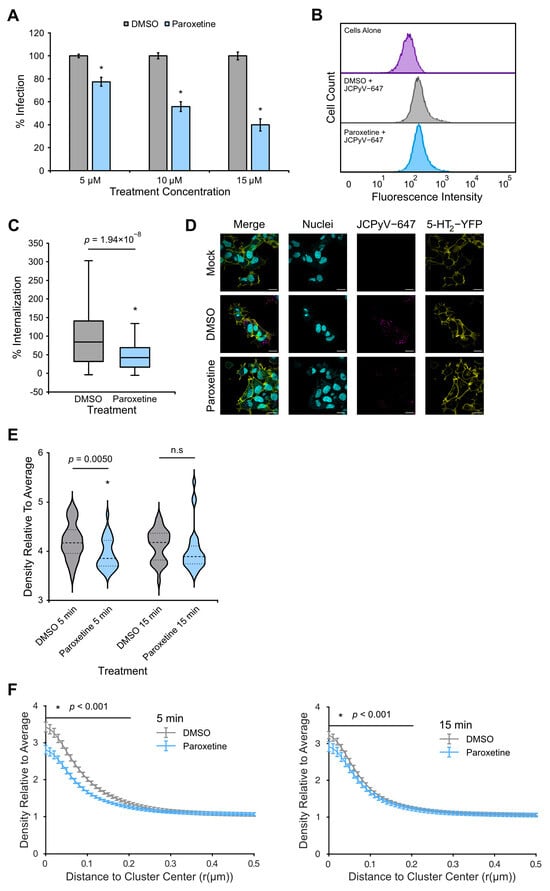 Paroxetine reduces JCPyV entry and receptor clustering in HEK cells. (A) HEK-2C-YFP cells were pre-treated with paroxetine or DMSO control at 37 °C for 1 h and infected with JCPyV (MOI = 1 FFU/cell) in the absence of drug at 37 °C for 1 h. Cells were fed with media containing paroxetine or DMSO and incubated at 37 °C for 48 h. After fixation, cells were stained for TAg and DAPI. FFU assay was used to quantify infection of 5 FOV/well at 20×, and percent infection was determined by dividing the number of TAg+ cells by the total number of cells and normalizing to 100%. Graphs represent 3 biological replicates performed in triplicate, and error bars represent SEM. (B) HEK-2C-YFP cells were pre-treated with paroxetine [15 μM] or DMSO at 37 °C and then infected with JCPyV-647 on ice. Samples were fixed and analyzed by flow cytometry using a BD LSR II with an APC laser line (640 nm) to measure attachment. FACSDiva and FlowJo software were used to analyze data, and gating was performed to exclude dead or complex cells. At least 5000 events were analyzed per sample. (C) HEK-2C-YFP cells were pre-treated with paroxetine [15 μM] or DMSO at 37 °C for 1 h and pre-chilled at 4 °C for 1 h. Cells were incubated with JCPyV-647 at 4 °C for 1 h (attachment), and plates were shifted to 37 °C for 2 h (entry) before fixation. Cells were stained with DAPI and imaged on a Zeiss LSM 980 confocal microscope at 63× magnification. Virus internalization was quantified using ImageJ. ROIs were drawn around the perimeter of each cell, excluding the plasma membrane, and mean intensity values of internalized virus were quantified. At least 30 cells were analyzed per sample. (D) Representative images from confocal microscopy. Nuclei (cyan), JCPyV-647 (magenta) and 5-HT2C-YFP (yellow). Scale bars = 20 μm. (E) HEK-2C-Dendra2 cells were pre-treated with paroxetine [15 μM] or DMSO at 37 °C for 1 h, pre-chilled at 4 °C for 1 h, and JCPyV-647 was added at 4 °C for 1 h. Media containing paroxetine or DMSO was added, and cells were incubated at 37 °C for 5 or 15 min before fixation. Cells were imaged on a custom FPALM microscope, and images were processed using custom MATLAB scripts. Clusters were identified by single linkage cluster analysis, and their density distributions are shown by violin plots. Violin plots represent an average of 30 cells. Dashed lines = means; dotted lines = quartile distributions. (F) Cluster properties were determined by RDF analysis, where an RDF value of 1 indicates local density equal to average, RDF > 1 indicates clustering, and RDF < 1 indicates depletion. The data shown in RDF graphs represent averages of a minimum of 5000 individual clusters. All graphs represent 3 biological replicates, and error bars represent SEM. Student’s t-test was used to determine statistical significance in (A–C) *, p < 0.05 or p value as indicated in figure. Wilcoxon signed-rank tests were used to determine statistical significance in (E,F) with a Bonferroni–Holm correction in (F) with p values indicated in figure. n.s. = not statistically significant.