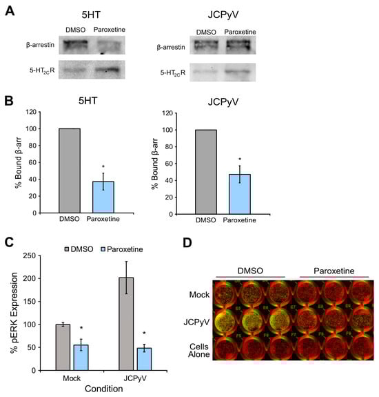 To determine whether paroxetine inhibits β-arrestin recruitment to the receptor, 5-HT2R pulldown assays were performed. The results demonstrated a sizable reduction in receptor-bound β-arrestin upon treatment with paroxetine (Figure 6B), supporting the idea that paroxetine impacts viral entry by inhibiting β-arrestin binding to the 5-HT2R likely by inhibiting GRK2. Utilizing GRK2 as a drug target has also shown to be an effective method against influenza virus infection. Paroxetine treatment reduced influenza virus infection during viral entry, as this virus relies on GRK, β-arrestin, and MAPK signaling for internalization and uncoating [26,51]. Similar to influenza virus, β-arrestin recruitment during JCPyV infection activates the MAPK signaling pathway, resulting in the phosphorylation of ERK, which is an event required for productive infection [30,31,53].