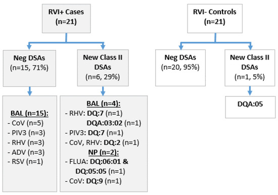 Flow chart depicts development of DSA in cases and controls and characteristics of RVI among cases. BAL, bronchoalveolar lavage. NP, nasopharyngeal swab. CoV, coronavirus (endemic). PIV3, parainfluenza virus 3. RHV, rhinovirus. ADV, adenovirus. RSV, respiratory syncytial virus.