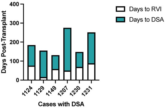Bar plots show time (days) post-transplant for RVI and DSA development among the 6 cases under study. Days to RVI is indicated in white and days to DSA is indicated in aqua. De-identified case numbers are presented on the x-axis.