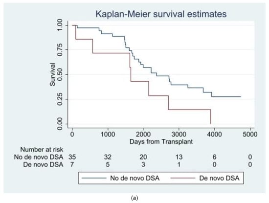 The primary endpoint was the percentage of LTRs among cases versus controls, who developed de novo DSA between the baseline and the follow-up time points. The exploratory endpoint was the association between the development of de novo DSA and a composite endpoint of CLAD and death. The chi-squared test or Fisher’s exact test (dichotomous) and Wilcoxon rank sum test (continuous) were used as applicable for the primary and exploratory endpoints and to compare baseline variables. Kaplan–Meier curves were also used to estimate and graph the probability of the composite endpoint of CLAD (including all sub-types) and death. Stata version 16 was used for all statistical analyses (StataCorp, College Station, TX, USA).