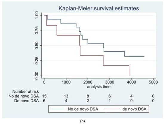 (a) Kaplan–Maier of composite endpoint of CLAD and death by development of de novo DSA. (b) Kaplan–Maier of composite endpoint of CLAD and death by development of de novo DSAs in LTRs with symptomatic respiratory virus infection (cases).