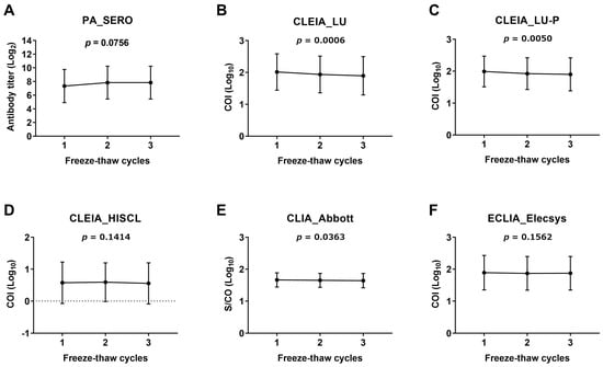Effect of freeze–thaw cycles on the measurement of anti-HTLV-1 antibody quantitative data in CSF. Six cases of CSF—two low, two medium, and two high titers—were employed in the assay for each test kit (see the Section 2.5 for details). The CSF underwent one, two, or three freeze–thawing cycles, and the anti-HTLV-1 antibody titers were assessed. Measurements for each time point are displayed as the mean ± SD. A one-way repeated-measures ANOVA was used to compare the corresponding data among the three conditions. p ≤ 0.05 was considered statistically significant. COI, cutoff index; S/CO, signal-to-cutoff ratio. Information on each test kit is shown in Table 1.