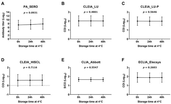 The PA method (SERO) showed a trend toward increased antibody titers following freeze–thaw cycles. However, this difference was not statistically significant (p = 0.0756; Figure 1A). In contrast, for the other methods (Figure 1B–F), the antibody levels (COI and S/CO) after the third freeze–thaw cycle were lower than those after the first freeze–thaw cycle. For three of the test kits (LU, LU-P, and Abbott), the antibody levels decreased significantly with each freeze–thaw cycle (Figure 1B,C,E). Regarding the storage time at 4 °C, the PA method (SERO) showed an increasing trend in the antibody titer as the storage time increased from 0 to 48 h (Figure 2A). However, the changes in antibody levels over the 48-h storage period in all methods, including the PA method, were not significant (Figure 2B–F).