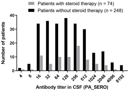 Distribution of CSF anti-HTLV-1 antibody titers in patients with HAM. The vertical axis represents the number of patients, and the horizontal axis represents the antibody titer measured using the PA method. Of the 322 patients with HAM, 248 were not on steroid therapy (black), and 74 were on steroid therapy (gray).
