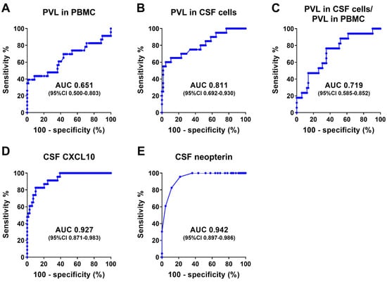 In addition to anti-HTLV-1 antibodies, the CSF inflammatory markers CXCL10 and neopterin were effective in distinguishing patients with HAM from HTLV-1 carriers (Figure 4; AUCs of 0.927 and 0.942, respectively), which is consistent with previous findings [23]. Conversely, the diagnostic accuracies of the PVL in CSF cells and the ratio of the PVL in CSF cells to that in PBMCs were relatively low (AUCs of 0.8111 and 0.719, respectively). These findings differ slightly from those of previous reports suggesting that these markers are useful for HAM diagnosis [21]. These discrepancies may be due to differences in the study populations. Regarding other CSF markers, it is known that there is no difference between patients with HAM and HTLV-1 carriers in terms of IgG and total protein in the CSF and that the ability of the CSF cell count to distinguish HAM is lower than that of CSF CXCL10 and neopterin [23]. In this study, patients with HAM had higher levels of CSF inflammatory markers associated with Th1 responses and higher CSF anti-HTLV-1 antibody titers than HTLV-1 carriers, indicating that both cellular and humoral immunity play a role in HAM pathogenesis. This finding is supported by previous studies [5,33].