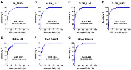 To evaluate the diagnostic performance of the seven quantifiable test kits (excluding the non-quantifiable IC_ESPLINE and LIA_INNO-LIA) in distinguishing patients with HAM from HTLV-1 carriers, an ROC analysis was performed using data from 92 cases (Figure 5). All seven test kits demonstrated AUCs greater than 0.9, indicating excellent diagnostic performance. Considering the 95% confidence interval, these seven kits were considered to have approximately equivalent diagnostic performance.