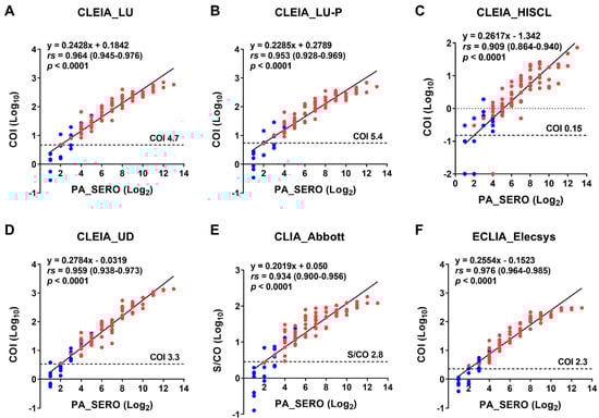 Correlations with the PA method. Using the results of anti-HTLV-1 antibody titers from 92 CSF samples (69 patients with HAM [red] and 23 carriers [blue]), we examined the correlations between the PA method and six other test kits. Antibody titers for the PA method are indicated as Log2 values, and antibody levels (COI and S/CO) for all other test kits are demonstrated as Log10 values. The linear equation, Spearman’s rank correlation coefficient (rs), 95% confidence interval, and p-value are shown in the figure. COI, cutoff index; S/CO, signal-to-cutoff ratio. Information on each test kit is shown in Table 1.