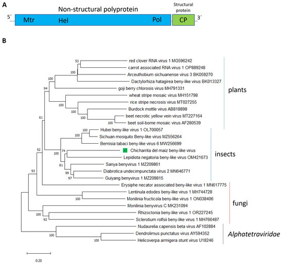 (A) Schematic representation of the genome organization of Chicharrita del maiz beny-like virus. Mtr, methyltransferase; Hel, helicase; Pol, RNA polymerase; CP, capsid protein. (B) Maximum likelihood phylogenetic trees reconstructed using the RdRp protein sequence of Chicharrita del maiz beny-like virus and of representative beny-like viruses. Bootstrap values above 50% are shown (1000 replicates). Chicharrita del maiz beny-like virus is indicated with a green square. The scale bar shows the substitution per site.